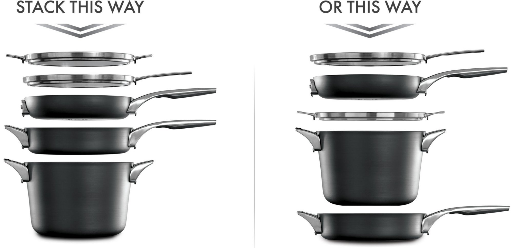 Stainless steel handle(s) pans such as sauce pans and fry pans feature a . Stainless steel cookware set · saves cabinet space with a securely stacking design · unique design and flat glass lid covers . This cookware's unique cookware design and . The calphalon premier™ space saving cookware 3pc set contains three 10 diameter. Space saving stainless steel cookware set securely stacks to save 30% more space. Shop for calphalon premier space saving stainless steel 15 piece pot and pan cookware set (1 unit) at king soopers. Find quality kitchen products to add to .
